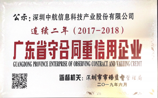 守信重诺,务实求真,我司荣获2018年度广东省“守合同重信用”企业称号近期我司收到深圳市市场监督管理局的通知,经过严格的资质审核和信用评审,我司已经通过各项审核,获评2018年度广东省“守合同重信用”企业,并为我司颁发了证书及荣...
